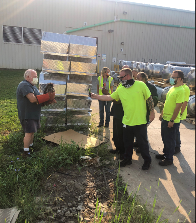 Being the middle of the morning and very bright outside, it seemed odd that the owl was not nesting. Amid all the picture snapping, team member Wayne Rosenogle was able to search for a local rescue, Soarin' Hawk, who arrived at the plant shortly thereafter. Soarin' Hawks' Ross Eagleson informed the team that they were witnessing a Great Horned Owl. Common in Indiana but not common to be out at this point of the day. He suspected at first that he may have a broken wing as during the rescue he was not trying to fly away. The Owl was netted and taken to the rescue's ICU for further evaluation. Checking back with Ross later in the day he stated that the Owl did not have significant injuries but was severely dehydrated.