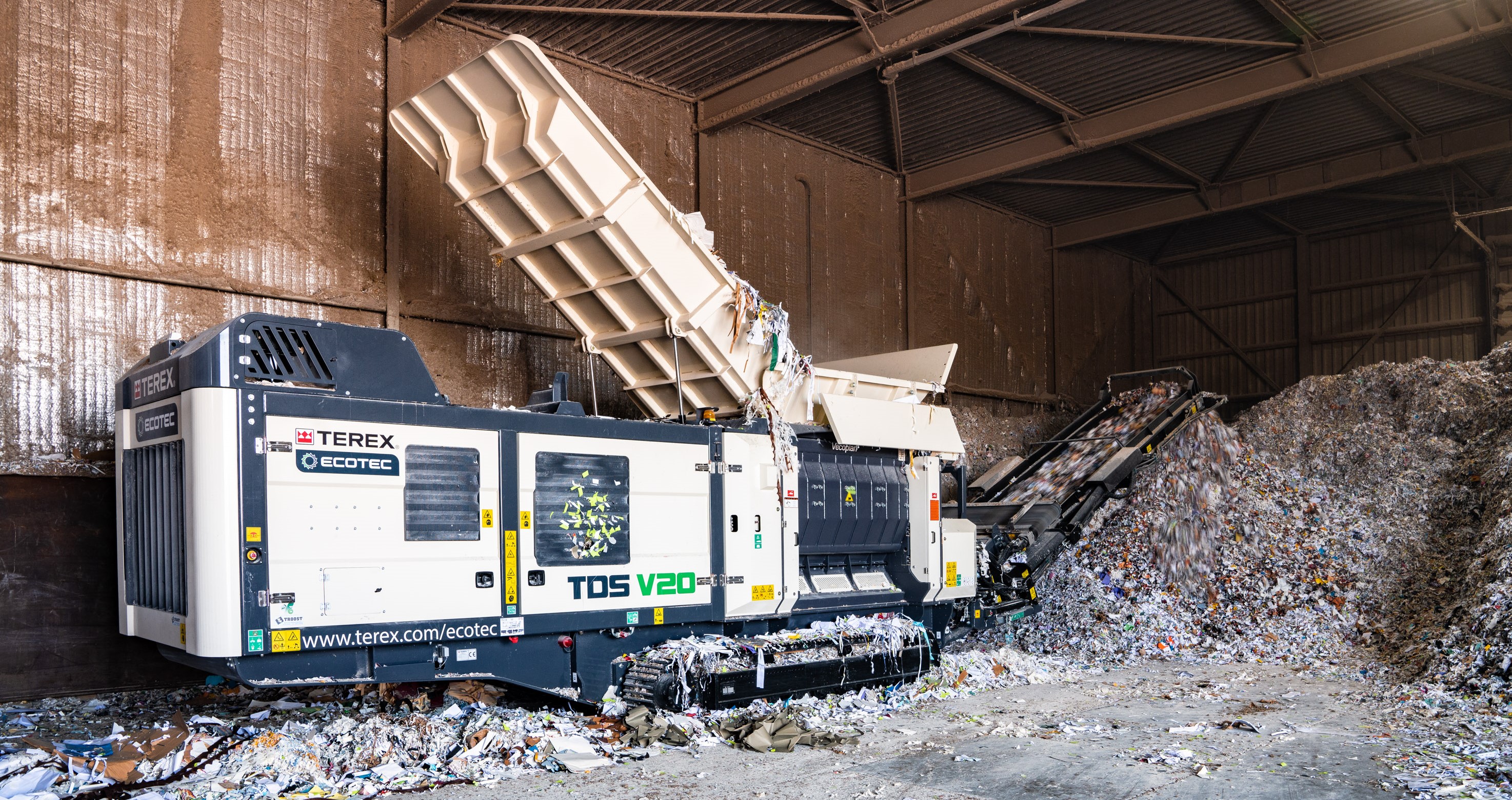 The machine was commissioned by service partner Troost Machinehandel B.V. equipped with a Stage 5 diesel engine of 493 horsepower, reversible hydraulic fan, internal fire suppression system, rubber pads on the steel tracks (because the machine is moved indoors) and a long conveyor belt, with a 5-metre discharge height. The TDS V20 gave the desired results during testing, with Rudolf saying that the team at Peute Recycling were very impressed with the performance of the machine.