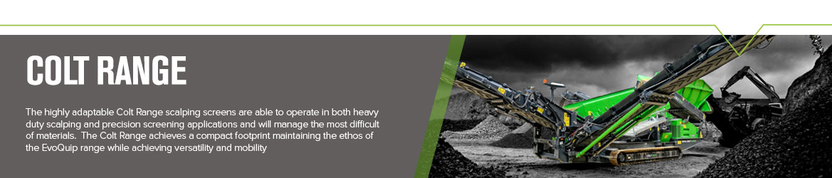 All basis are covered with the Colt Scalping Screen, Harrier Compact Screen and The Falcon Inclined Screen making up the EvoQuip screening range. These track mounted mobile screeners are designed with the same commitment to excellence that is expected with all EvoQuip equipment. Use the links below to learn more.