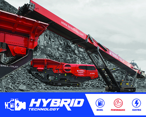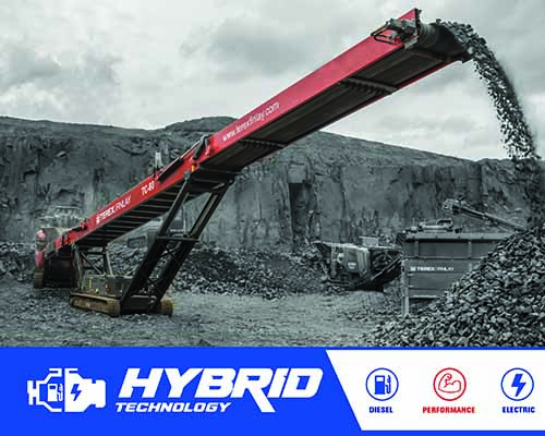 El transportador Finlay® TC-100 está disponible con tecnología de unidad híbrida, basada en motores eléctricos a bordo que otorgan la versatilidad suficiente para que la instalación trabaje desde una fuente de alimentación externa o un motor estándar a bordo. Esta máquina cuenta con un transportador de producto de 30 m (98' 9") capaz de producir una capacidad máxima de apilamiento cónico basada en un ángulo de reposo de 37°: 6632 toneladas (7310 toneladas EE. UU.).