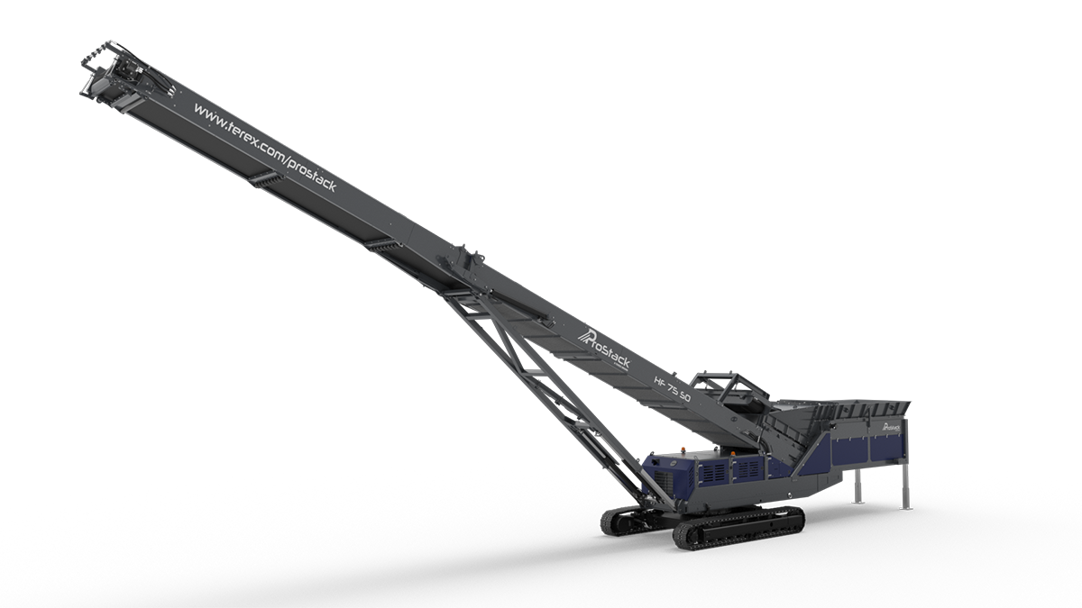 The ProStack HF 75 SO rotating track conveyor has been specifically designed to work alongside other Terex machines so that it can be used as a mobile link conveyor.