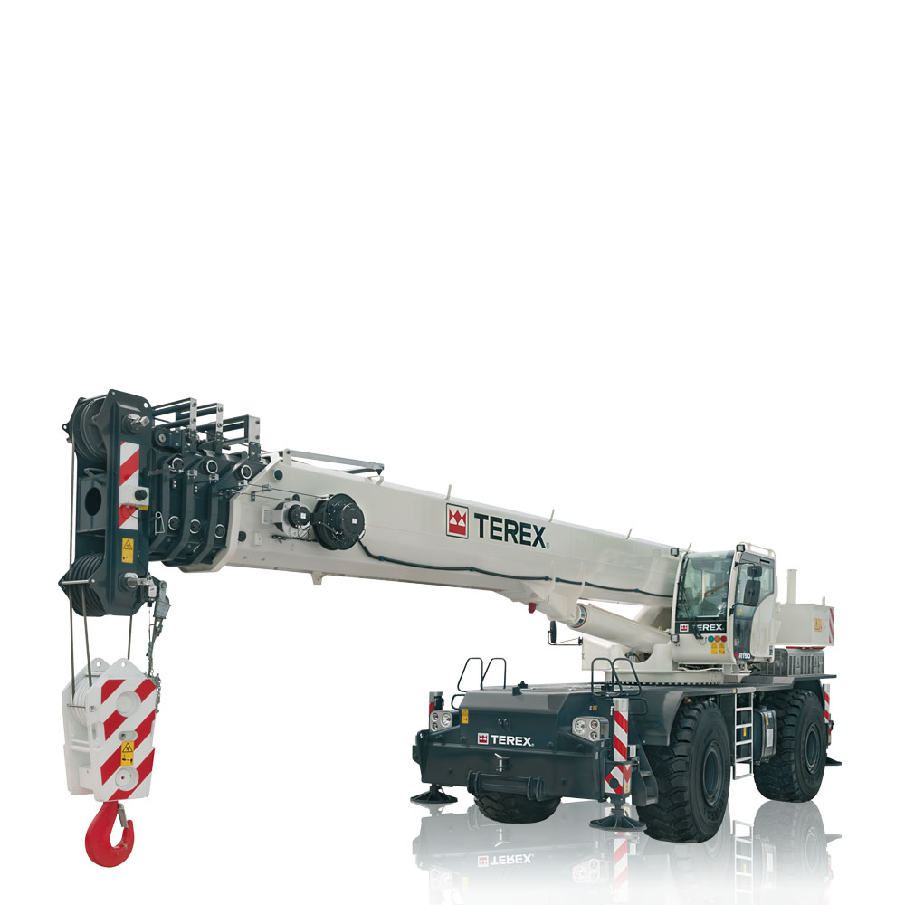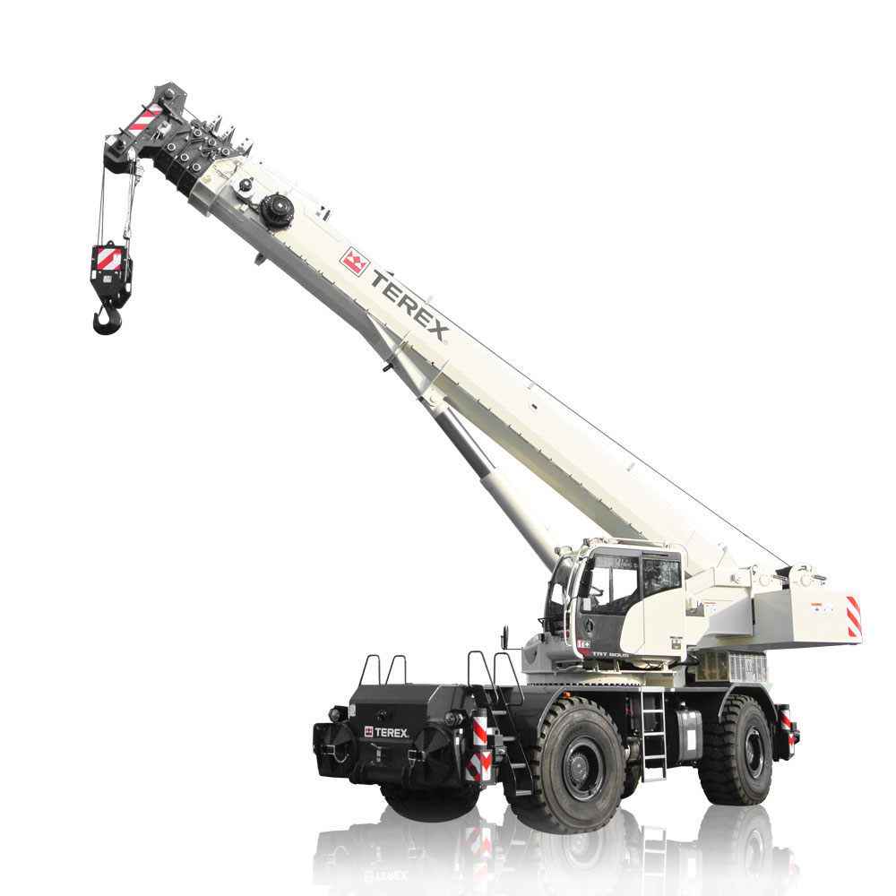 The new TRT 80US is a 80 USt rough terrain crane with a 138 ft five section boom with three telescoping modes. It features the new TEOS Terex Operating System.