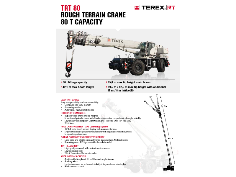 La nuova gru fuoristrada Terex TRT 80 presenta una capacità di 80 t con un braccio estensibile fino a 42.1 m. Questo nuovo modello è dotato del nuovo sistema di controllo TEOS Terex