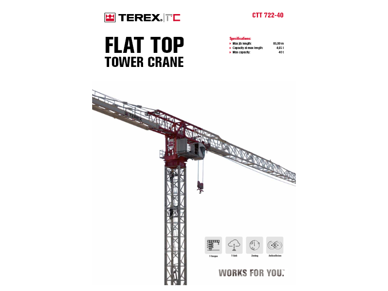 The CTT 722-40 flat top tower crane has a max jib length of 85 m (279 ft) and a maximum capacity of 40 t (88,200 lbs).