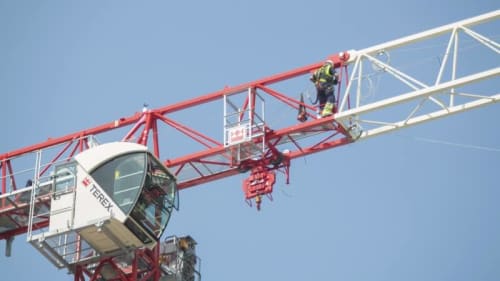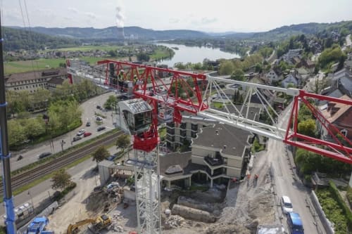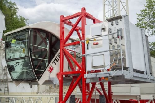 The CTT 182-8 flat top tower crane has a max jib length of 65 m (213 ft) and a maximum capacity of 8 t (8.8 USt).