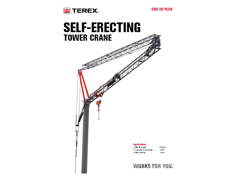 The CBR 28 PLUS self erecting tower crane has a maximum capacity of 2.5 t (2.76 USt) and a jib tip capacity of 0.9 t (0.99 USt).