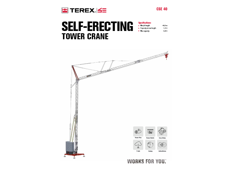 The new CSE 40 Self Erecting Tower Crane features a jib length of 40 m (131 ft) and a maximum capacity of 4.4 t (4.85 USt). The new crane design, motors and electronic control definitely improve performances and usability. The fully electronic control