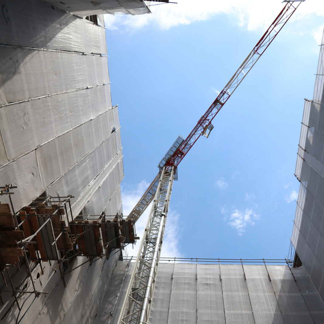 Anche in questo caso una rilevante complessità ha riguardato il posizionamento della “Flat Top” (nella fattispecie un’altra gru a torre CTT 91-5, configurata con un’altezza di 42 m e un braccio da 45 m), avvenuto in toto all’interno dell’edificio e quindi con le relative predisposizioni e accortezze in termini logistici e la gestione del carico/scarico avvenuto direttamente dalla strada.