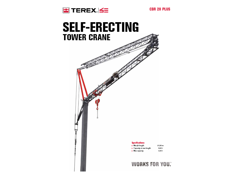 La gru a torre automontante CBR 21H offre una capacità massima di 1,6 t e una capacità in punta braccio di 0,6 t.